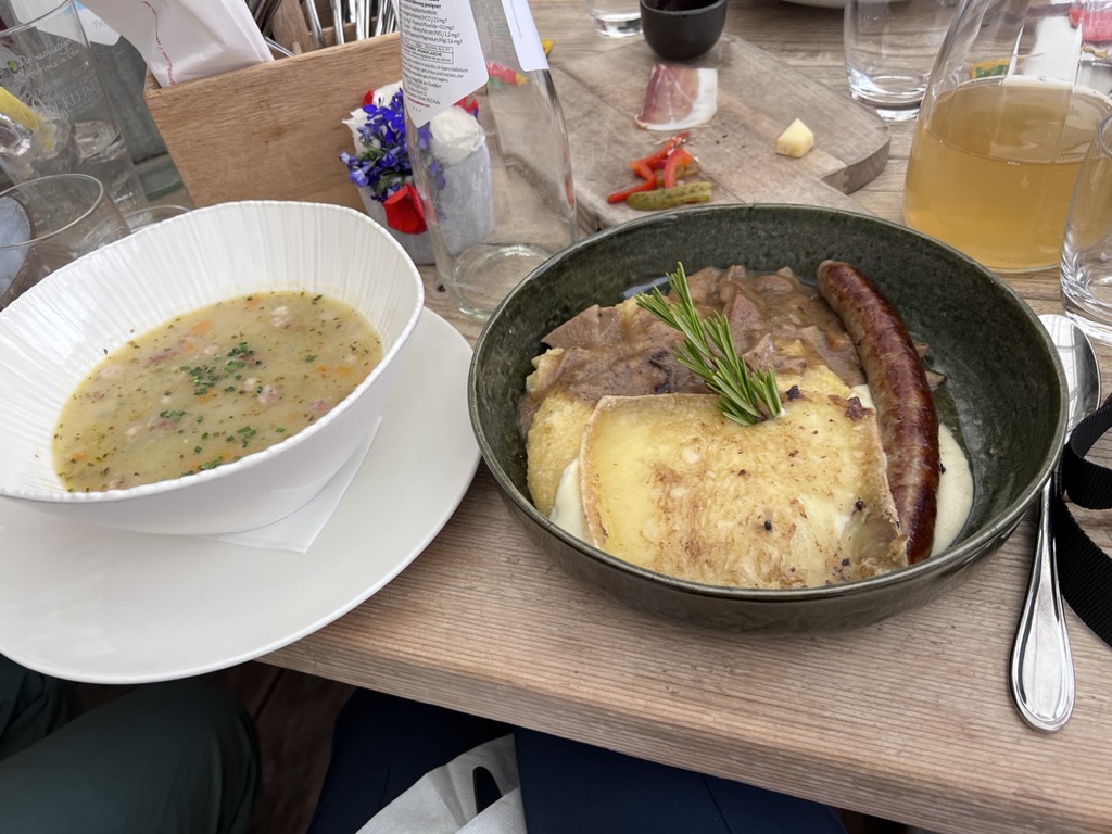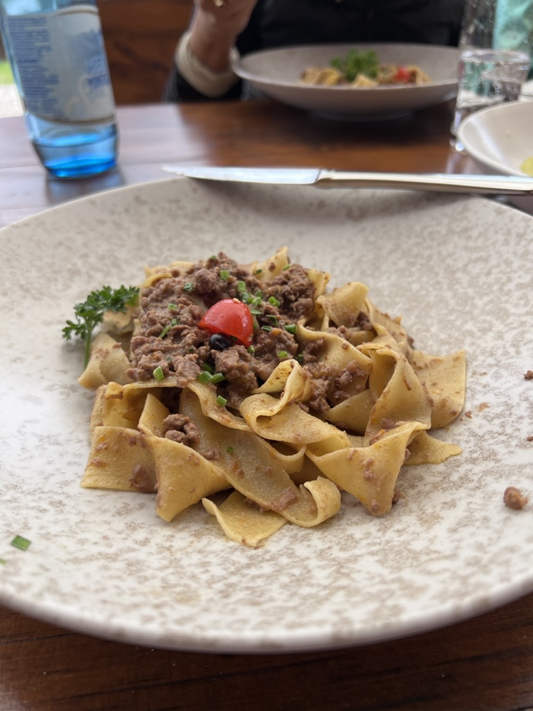 I knew the local food would be carb heavy and hearty and I was not disappointed.  The Dolomites sites on the border between Italy and Austria so you’ll see a mix of pasta dishes along with goulash and dumplings. I had tagliatelle with braised deer on several occasions and it was excellent (photo below).  Dinners start at 7 and most of the towns have a siesta from 3-5.  The majority of the meals started with a charcuterie and bread service that was enough of its own.  Add salad, pasta, meat course, and tiramisu and you’ll be more than satisfied.  Note it’s not a bad idea to bring an antacid after a heavy late meal night after night.